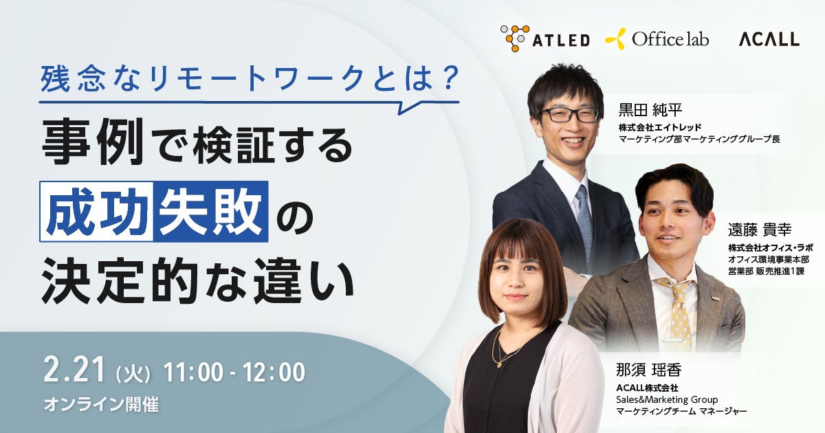 業務手続きの電子化(ワークフローシステム)大手の株式会社エイトレッド(本社:東京都渋谷区、代表取締役社長:岡本 康広 以下、エイトレッド)は、株式会社オフィス・ラボ、ACALL株式会社と共催で『残念なリモートワークとは? 事例で検証する成功失敗の決定的な違い』を2023年2月21日(火)にオンラインにて開催いたします。
