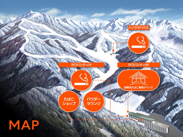 昨年に引き続き、カワバシティ8Fには加熱式たばこ専用ラウンジ、カワバシティ7Fおよびパノラマハウスには加熱式・紙巻たばこ対応の喫煙所を設置し、計3か所の喫煙スペースをご用意しています。メインとなる8Fでは雪景色を背景にした展示デバイスや演出映像を配置し、あたたかみのあるラウンジ仕様に仕上げました。7Fはゲレンデへのアクセス性が高く滑走の合間に立ち寄りやすい構成とし、パノラマハウスは景色を楽しみながら休憩できるスポットとして展開いたします。