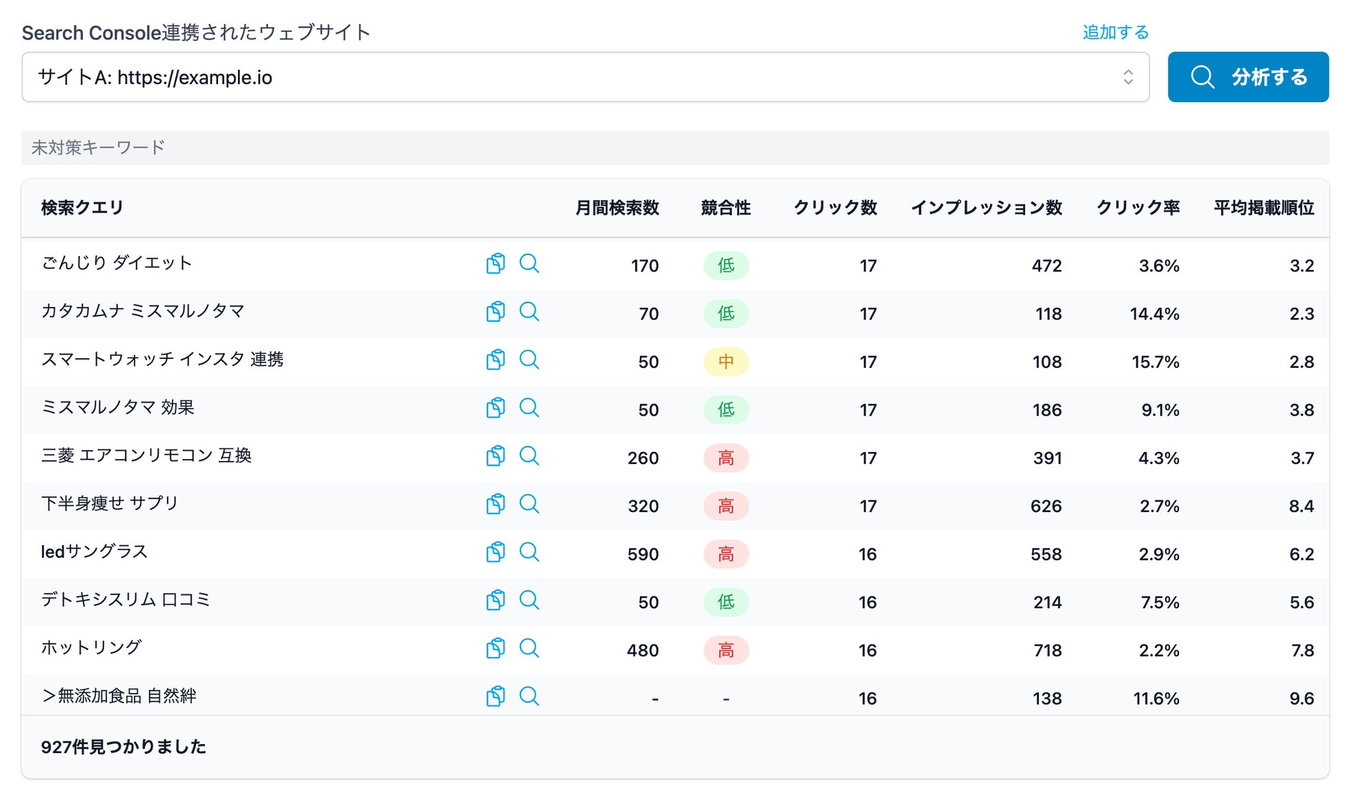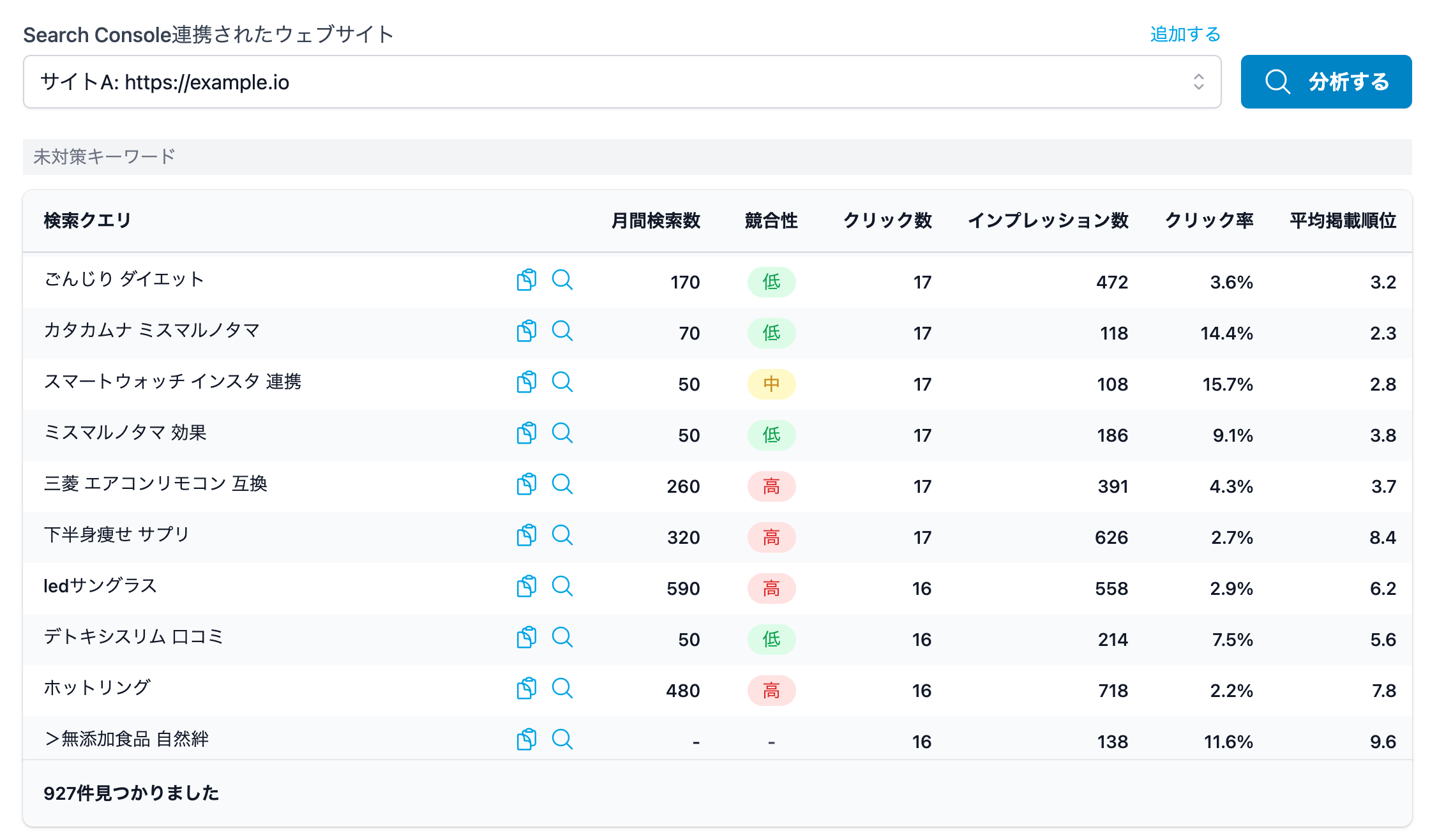 [分析する]ボタンをクリックすると、月間検索数や競合性を確認することが可能です。