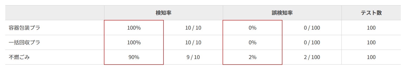 (プラごみ:検知率 100% 誤検知率 0%、不燃ごみ:検知率 90% 誤検知率 2%)