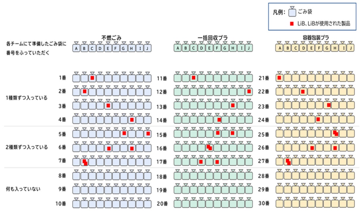 ・各チーム参加者に見えない状況で事務局がごみにLib、Libが使用された製品を混入する。ごみ袋の中からLib等を検知し、袋単位などで取り除く。