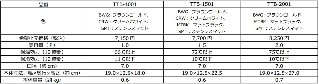 サイズは、1.0L、1.5L、2.0Lを展開。カラーは、ご自宅のインテリアに合わせてお選びいただけるカラーラインアップにリニューアル。落ち着いたカラーでインテリアになじみやすいブラウンゴールドやクリームホワイト、シックな色合いで高級感漂うマットブラック、ステンレスマットを展開します。