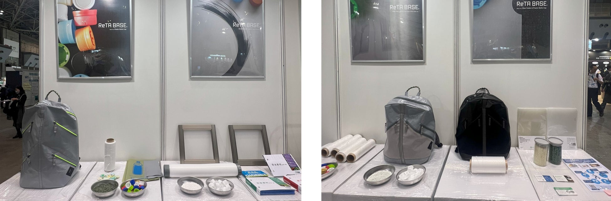 当社が株式会社TRIFE DESIGN(本社:東京都)等パートナー企業と共同開発し、ペットボトルキャップのアップサイクルによって生まれた「ポリエチレンクロス」に加え、本展示会で初めて「モノフィラメント」、「シート素材」のプロトタイプの展示を行いました。