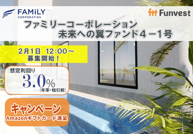 貸付型クラウドファンディング「Funvest」2/1より新ファンド「ファミリーコーポレーション 未来への翼ファンド4-1号」の募集開始