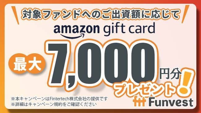 本ファンドへ出資していただいた投資家の皆様を対象として、出資額に応じて最大7,000円分のAmazonギフトカードをプレゼントするキャンペーンも併せて実施いたします。