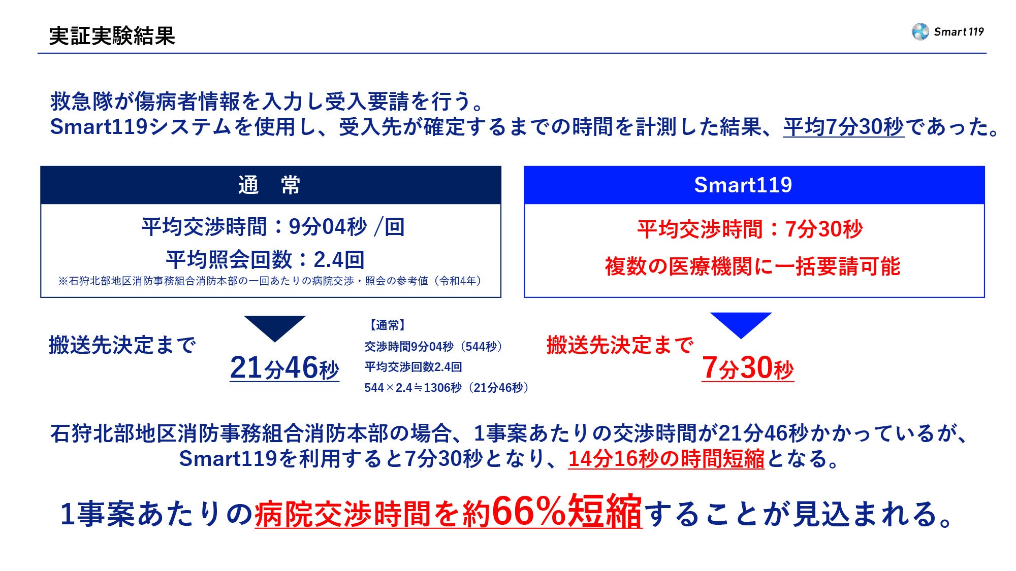 【約66%短縮!】救急医療情報システム「Smart119」が、救急搬送先決定時間を大幅に低減する可能性。石狩市など3市町村を対象に実証実験を実施