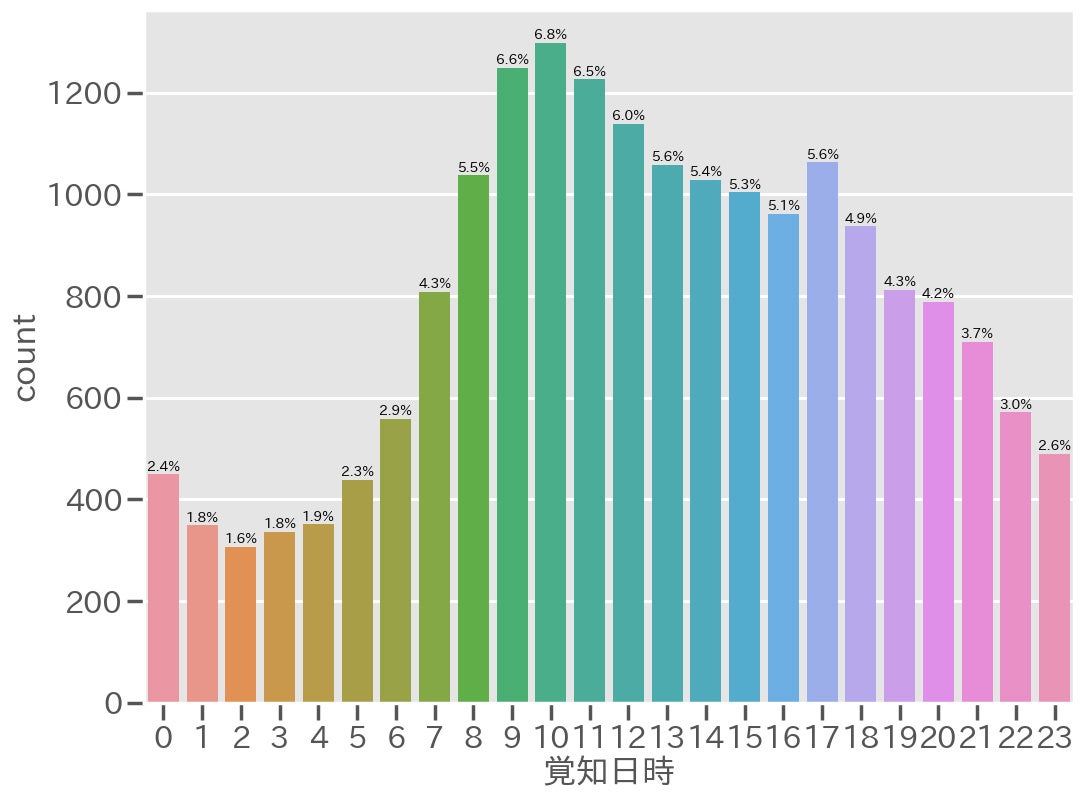 ▲ 日時から「覚知」を分析する。覚知時間別では午前10時(6.8%)に大きなピークがあり、一旦減少したのち、17時(5.6%)に小さなピークがあることがわかる。