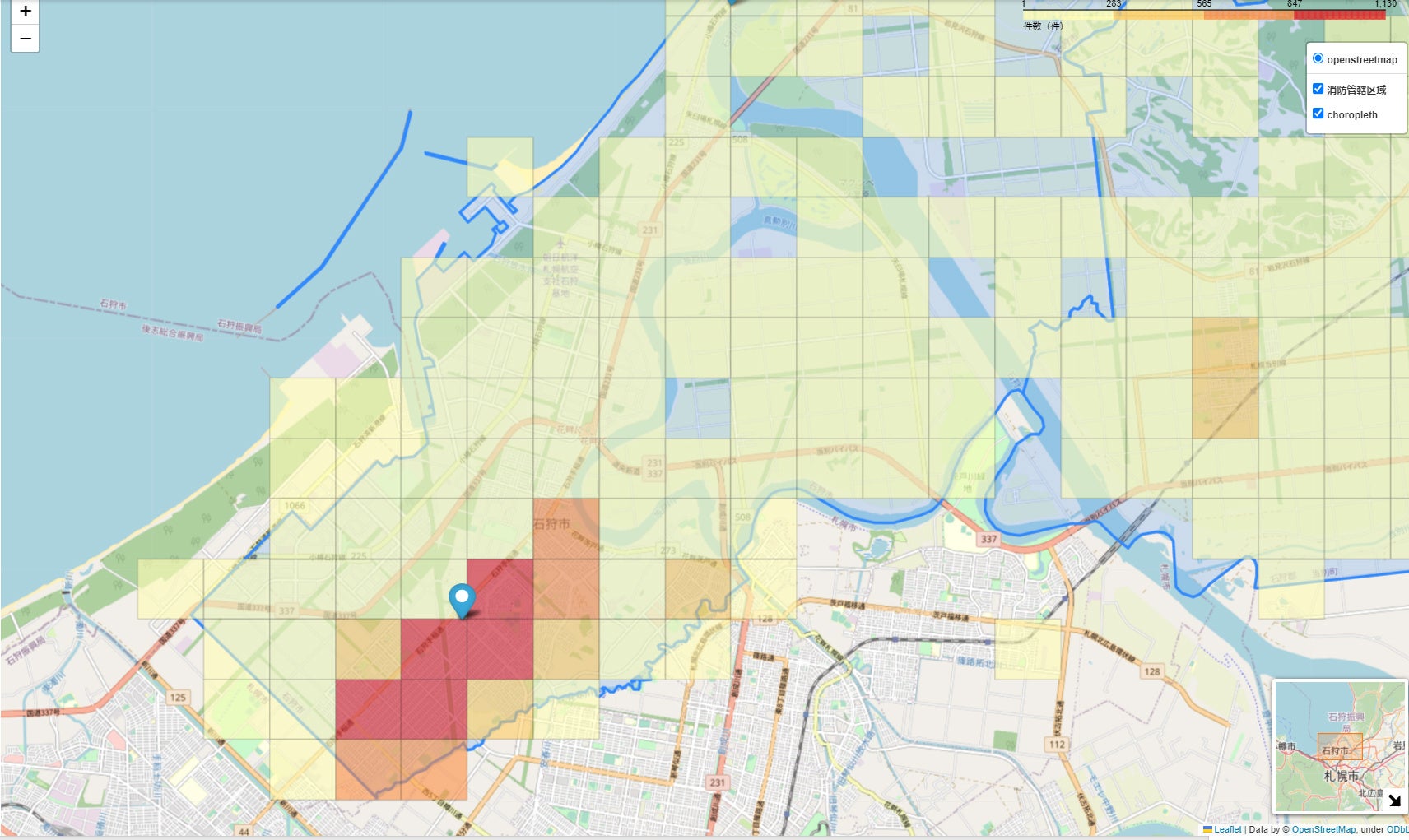 ▲ 過去5年間の救急発生箇所を1kmメッシュのコロプレス図で表す。その多くが、石狩市花川北、花川南地区に集中していることが視覚化される。