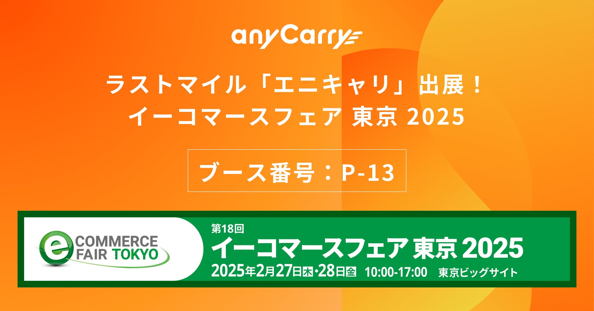 ラストマイル物流に特化した物流ソリューション事業を展開する株式会社エニキャリ(以下当社)は、2月27日(木)・28日(金) の2日間、東京ビッグサイト 東4ホールで開催される「イーコマースフェア 東京 2025」に出展します(小間番号:P-13)。