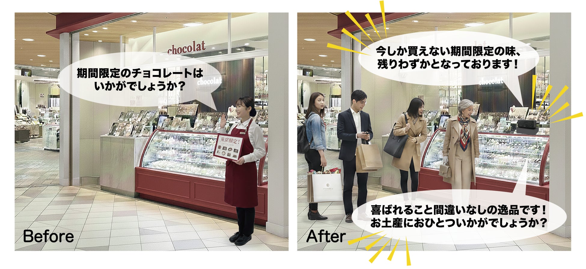 すでに実施した土産店での実証実験では、音声OFFの期間と比較して、売上総額が117%、入店客数が110%、購入客数(買い上げ点数)が113%に向上するという確かな効果を実証しております。また、店内の特定エリアにおける音声案内においても、箱入りお菓子の売上が46.6%増加、冷凍グルメが37.4%増加するなど、訴求した全カテゴリでプラス成長を記録いたしました。これらのデータは、感覚的な集客に頼らず、科学的に販促効果を創出できることを示しています。