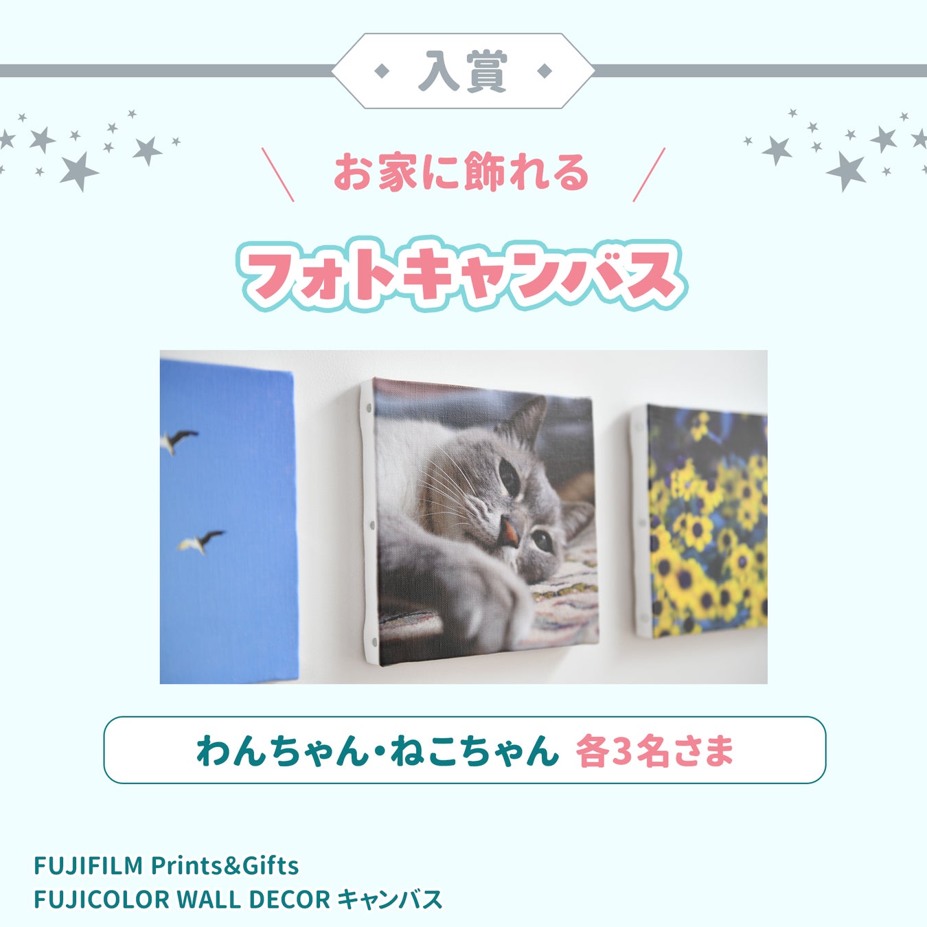 ご応募いただいたペットちゃんのお写真で作るオリジナルグッズを進呈いたします。 ・最優秀賞 わんちゃん部門、ねこちゃん部門各1名さま オーダーメイドオリジナル時計 ORIGINAL PET(オリジナルペット)製 ・入賞 わんちゃん部門、ねこちゃん部門各3名さま フォトキャンバス FUJIFILM Prints & Gifts製 |