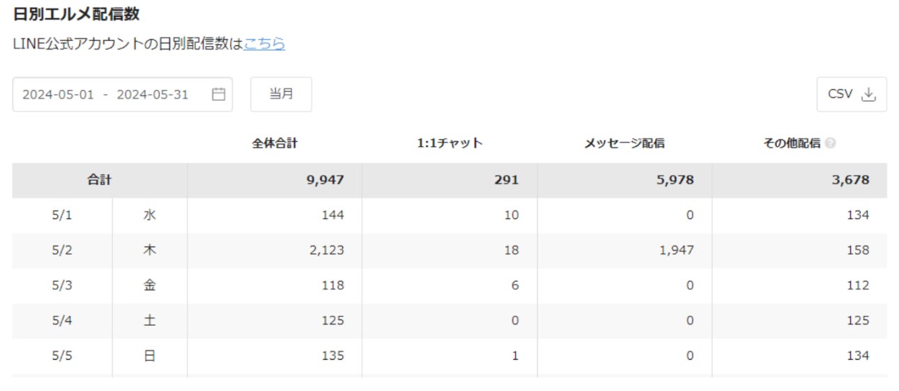 L Message(エルメ)については日別の配信数の一覧もあり、下記の確認およびCSVでの出力も可能です。