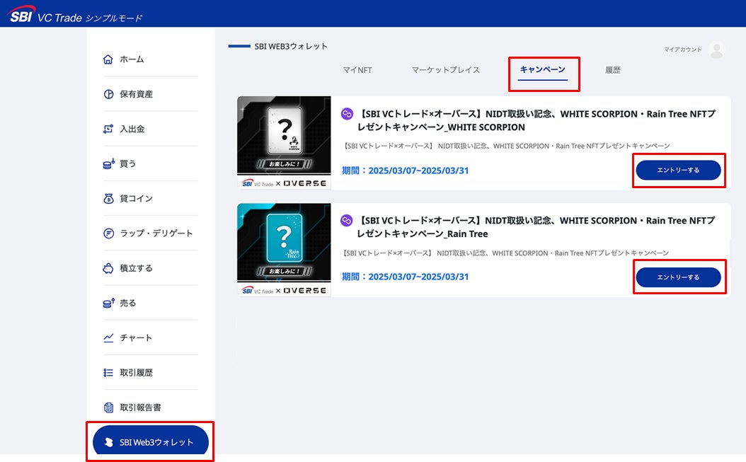 Web版の取引ツール「シンプルモード」にログインの上、メニュー「SBI Web3ウォレット」から「キャンペーン」をご選択いただき、「エントリーする」ボタンにてエントリーしてください。