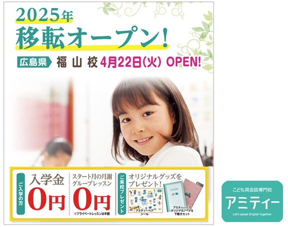 英会話教室を運営する株式会社イーオン(本社:東京都新宿区、代表取締役社長:重野卓、以下「イーオン」)は、2025年4月22日にアミティー福山校を移転オープンいたします。