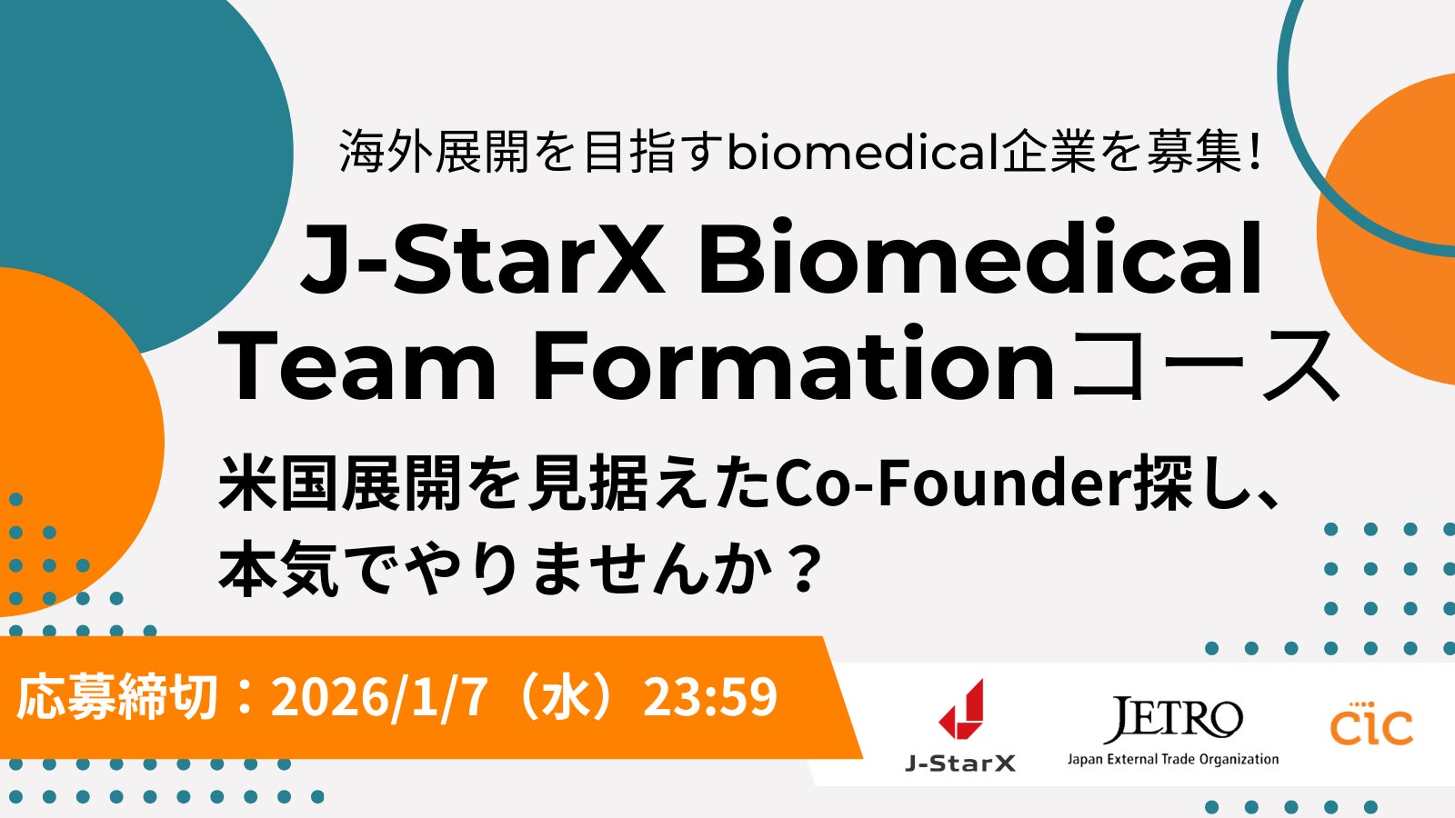 CIC (本社:米国マサチューセッツ州ケンブリッジ市、CEO : デニース・メドレンカ)は、JETRO(日本貿易振興機構)が主導する起業家育成・海外展開支援プログラム「J-StarX」の一環として、バイオメディカル分野に特化した「Biomedical Team Formationコース」の参加企業を募集します。