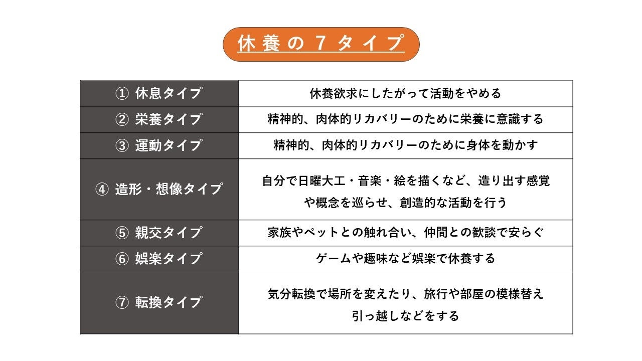 「休養学」とは、栄養や運動と並んで健康維持の要素となる「休養」を知識として正しく理解し、実践するためのものであり、一般社団法人日本リカバリー協会が監修する書籍『休養学基礎: 疲労を防ぐ!健康指導に活かす』において、休養は次の7つのタイプに分類されています。この7タイプを複合的に取り入れることで、明日のさらなる活力チャージにつながります。