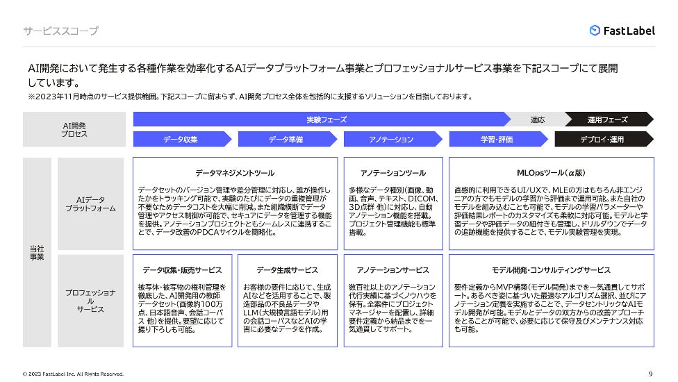 当社は、2020年1月の創業以来、AIデータプラットフォーム『FastLabel』の開発やアノテーション代行サービスの提供を主力事業として展開してまいりました。今後は、プラットフォームの開発やデータ収集の領域において生成AI(Generative AI)などを活用することで、よりお客様のニーズに沿うアノテーションデータを迅速に提供できるようにしていきたいと考えております。