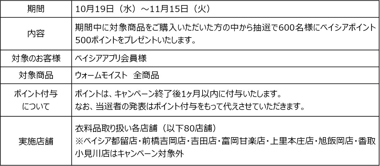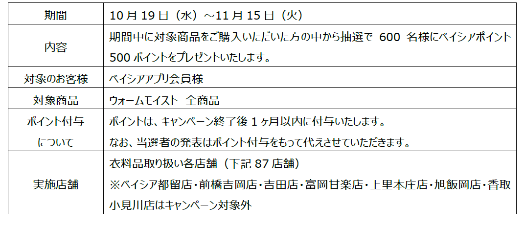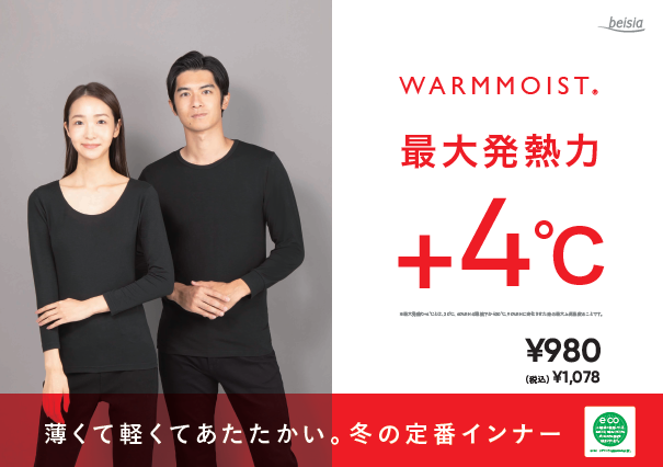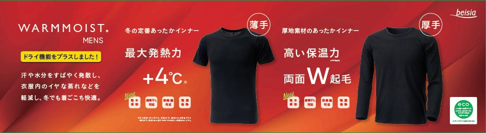 株式会社ベイシア(本社:群馬県前橋市、代表取締役社長:相木孝仁)は、新しくドライ機能を追加した秋冬シーズンのインナー「ウォームモイスト」を、衣料品取り扱い店舗87店舗※にて販売いたします。同商品は、汗や体内の蒸気を吸い込んで発熱する吸湿発熱性を備えており、さらに汗をかいても乾きやすい、洗濯しても早く乾くドライ機能を追加しました。またパッケージの一部に植物由来の原料を使用するバイオマス素材を採用した、環境にも配慮した商品です。なお、今シーズンの発売を記念して、商品をお買い上げいただいた方へキャンペーンも実施いたします。薄くてあたたかい「ウォームモイスト」をぜひお試しください。