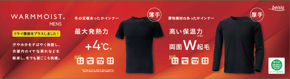 早く乾いて、あたたかく過ごせる商品になっております。薄手は、軽くてあたたかく、厚手は両面W起毛によりふっくらとした着心地です。日々、寒さが増してきておりますので、ぜひウォームモイストのあたたかさをお試しください。