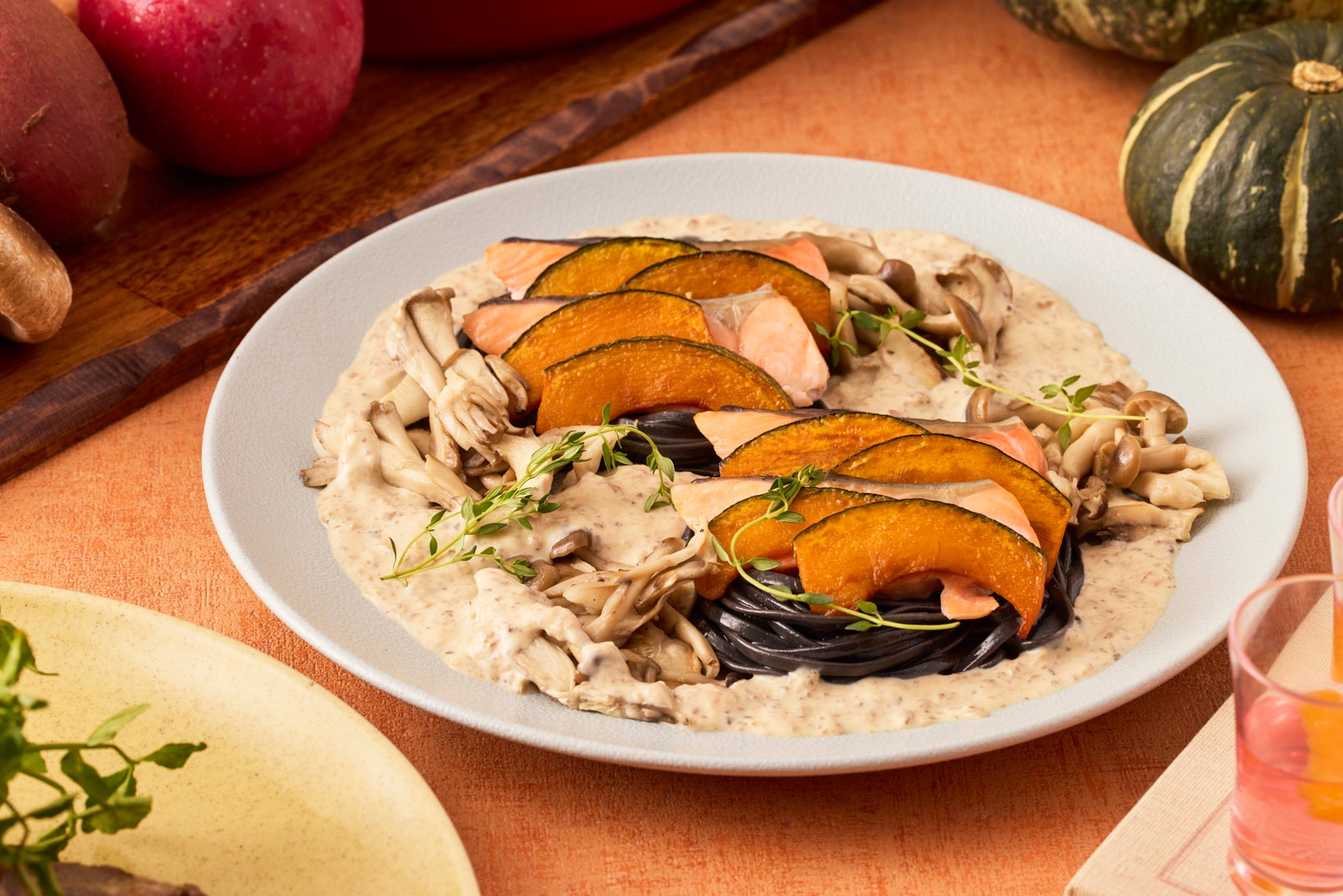 9〜10月はイカスミパスタとカボチャを合わせたハロウィン仕様、11月はじゃがいもと秋鮭にデュクセルクリームをかけた秋らしい一皿。