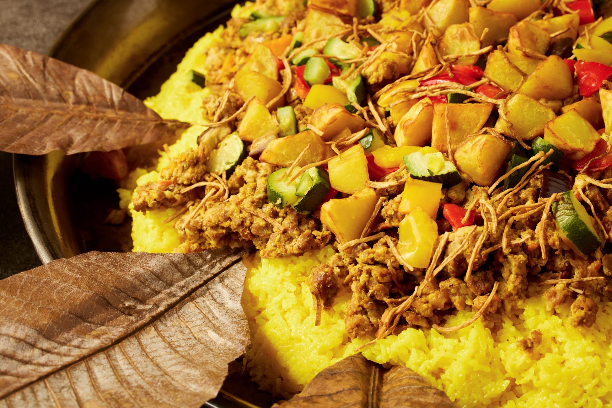 ディナーブッフェの、「ポークのスパイシー煮込みとサフランライス」は、クミンやコリアンダーなどのスパイスで漬け込んだ豚ひき肉を香味野菜と煮込み、サフランライスにさつまいもと彩り野菜を添えてパエリアパンで提供。