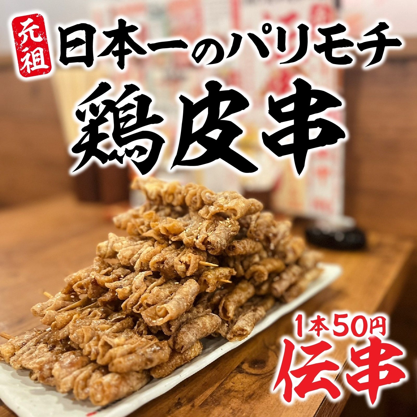 『新時代』にご来店頂いた方が必ずといっていいほど、ご注文頂くのが『伝串』です。伝串は、1本50円の揚げ鶏皮串です。一度食べると、やみつき。思わず何本も食べたくなり、平均お一人5本以上ご注文頂く、名実ともに名物商品です。