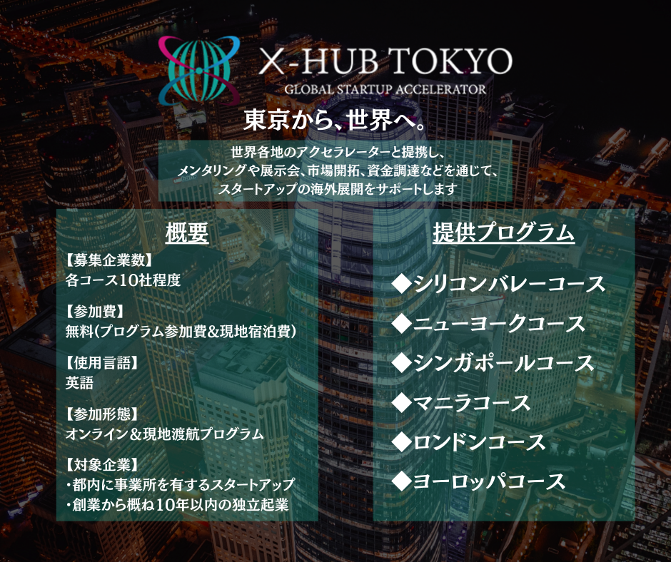 東京都主催・JETRO運営による都内スタートアップ支援プログラム『X-HUB TOKYO OUTBOUND PROGRAM 2023』の参加募集を開始しました。本プログラムは東京からグローバルに活躍するスタートアップを創出するために、都内スタートアップ企業への海外展開支援を行います。世界各地(シリコンバレー・ニューヨーク・シンガポール・マニラ・ロンドン・ヨーロッパ)の名だたるアクセラレーターと提携する全6コースを開催。ブートキャンプ・メンタリングからイベント参加・パートナー提携・資金調達まで、参加企業のニーズに応じた様々な機会を提供します。