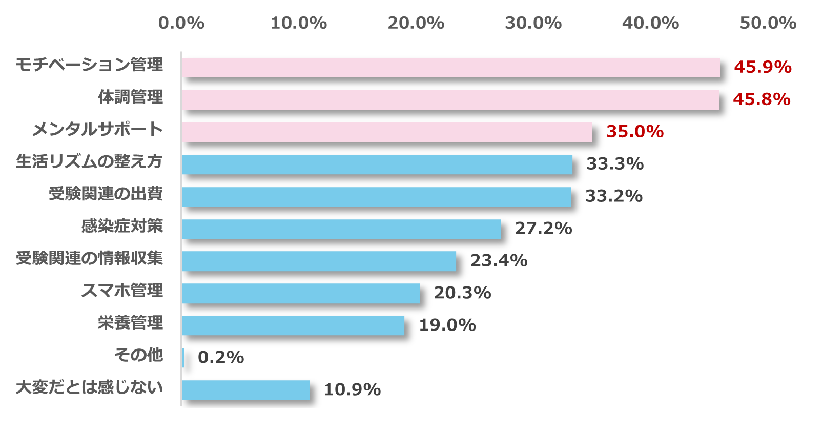 子どもの受験サポートをするにあたり、大変だと感じていることを質問したところ、最多回答は「「モチベーション管理(45.9%)」、次に「体調管理(45.8%)」、「メンタルサポート(35.0%)」と続きました。また、「大変だとは感じない」と回答した方は10.9%でした。