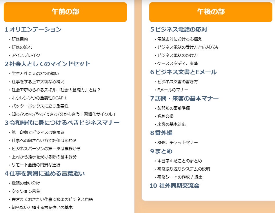敬語やビジネス電話の受け方、名刺交換などのビジネスの必須スキルをレクチャーします。