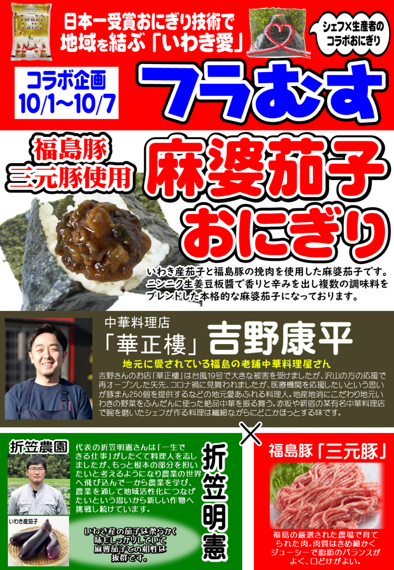 令和3年2月17日に、一般社団法人全国スーパーマーケット協会主催の「お弁当・お惣菜大賞2021 おにぎり部門」にて、最高の賞にあたる最優秀賞を受賞させていただいた「おにぎり」で、『地域を結ぶ』『想いを結ぶ』をコンセプトに、地元を愛する方々と共に『福島三元豚使用麻婆茄子おにぎり』を開発させていただきました。10月1日(土曜日)から10月7日(金曜日)まで期間・店舗限定でこのおにぎりをご提供させていただきます。