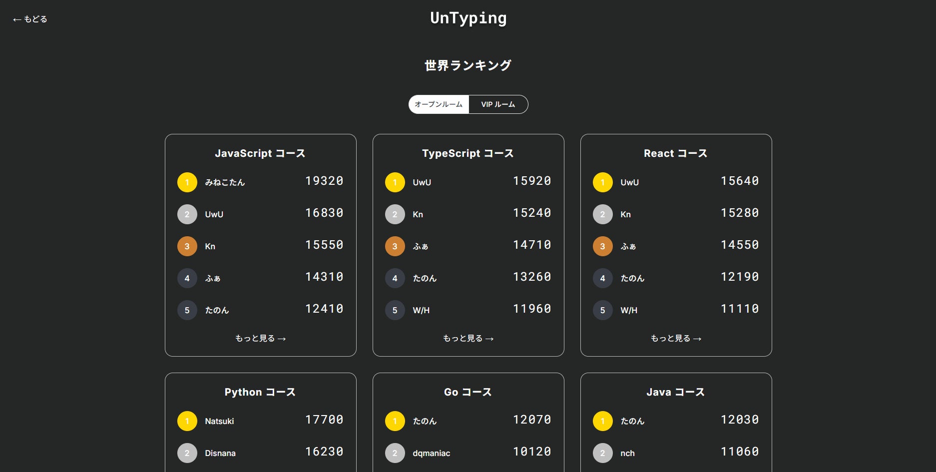 プログラミングタイピングゲーム「UnTyping」は、世界ランキング機能があります。それぞれのコースごとに、世界ランキングが算出されます。タイピングを練習して、世界ランキング 1 位を目指しましょう。