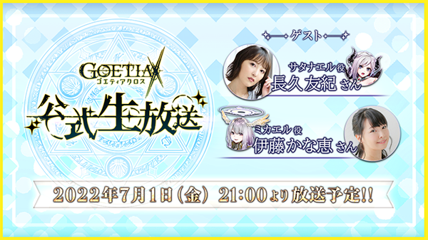 『ゴエティアクロス』の最新情報や攻略情報に加え、ゲストをもっと知ることができる一問一答コーナー、そして帰ってきた「とうばつできるかな?」のコーナーに、7月1日から始まる新イベントの紹介をする生放送企画です。