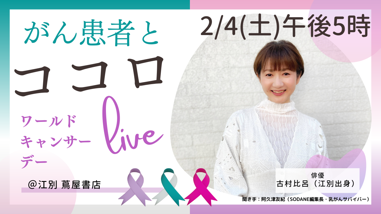 がんとともに生き、働くこととは? 子宮頸がんサバイバーの古村比呂さん(江別市出身)と乳がんサバイバーの阿久津友紀(HTB SODANE編集長)が語りあいます。2月4日のワールドキャンサーデーにあわせて 患者と家族のいい関係 社会と患者のいい関係を探ります。本会場である、江別蔦屋書店会場が満席となったため、一部をYouTube配信します。