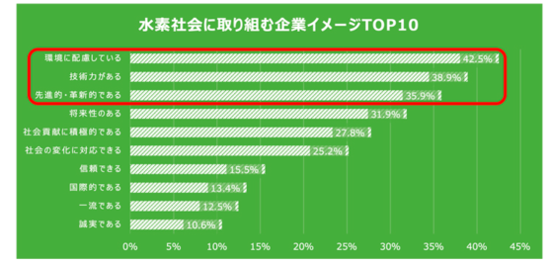・全体:1位「環境に配慮」42.5%、2位「技術力がある」38.9%、3位「先進的・革新的である」35.9%が上位