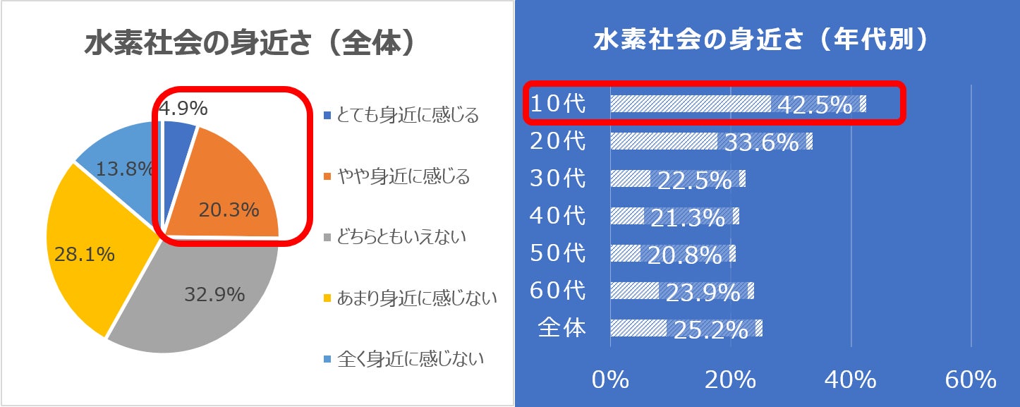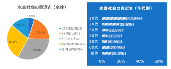 ・「水素社会」を身近に感じる人は全体の3割以下(年代別でみると10代は4割以上※学生においても同程度)