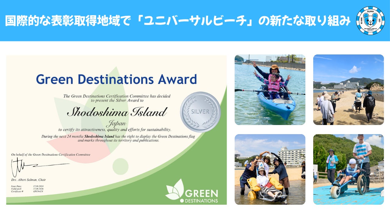 きょうだいプロジェクトの一つである香川県の小豆島は、持続可能な観光地の公式認証機関であるオランダの非営利団体 グリーン・デスティネーションズ(Green Destinations)が実施する国際表彰制度「グリーン・デスティネーションズアワード」において、シルバーアワードを受賞しており、ユニバーサルビーチづくりの取り組みは、環境や地域に配慮した「持続可能な観光地」づくりに大きく貢献しています。