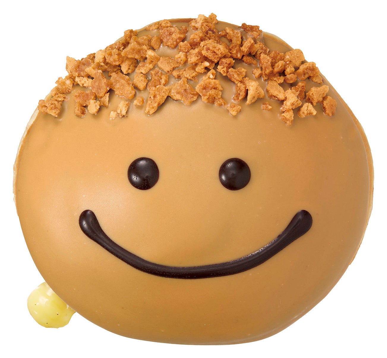 『キャラメル スマイル カスタード』 【販売期間】 2024年 5月29日(水)~6月16日(日) 【販売価格】 291円(イートイン297円) キャラメル香る丸い顔にチョコでスマイルを描き、カスタードクリームを入れました。 チャーミングなヘアスタイルは、香ばしいアーモンドクランチ。 ひとくち食べると、みんな笑顔になるスマイルドーナツです。 |