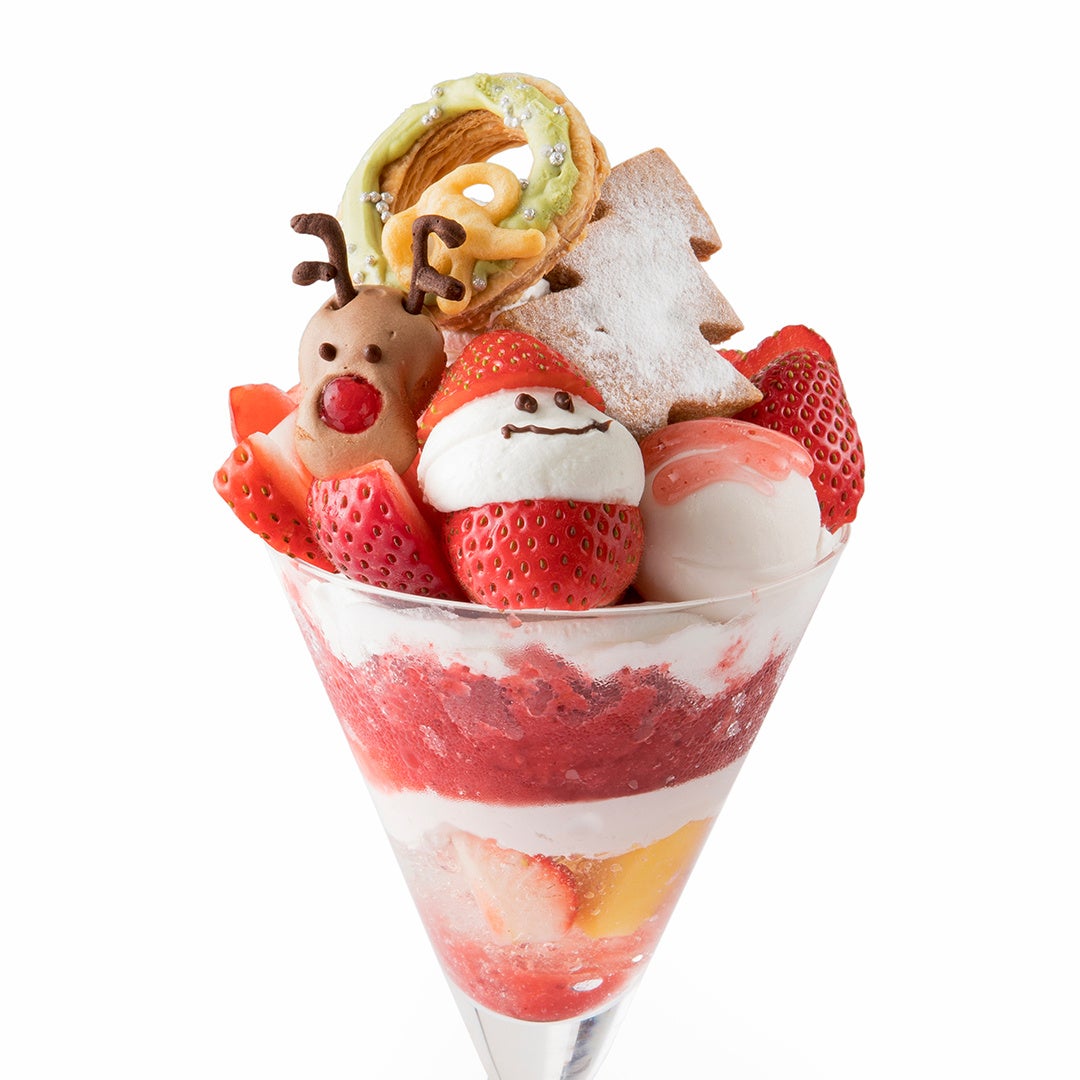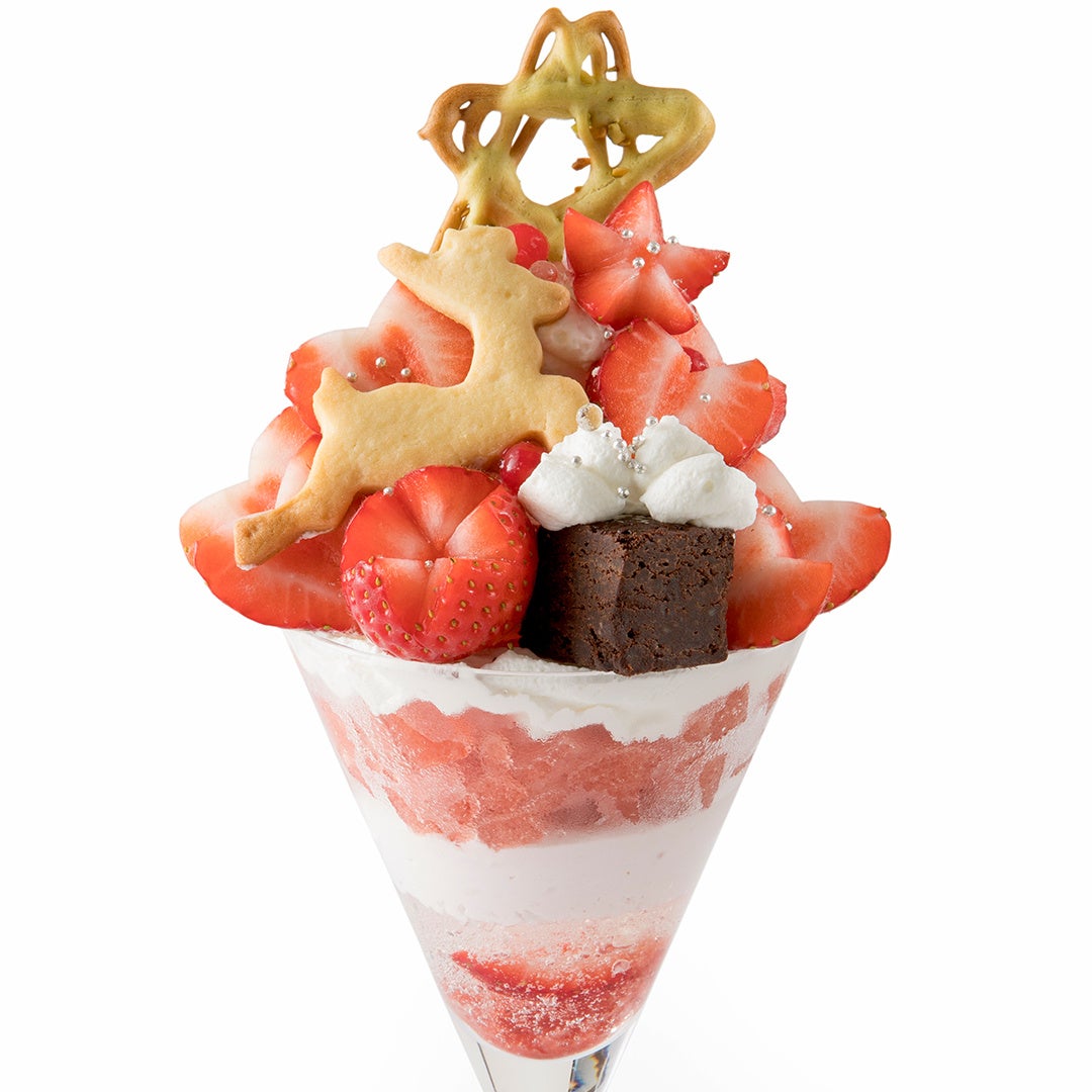 タカノフルーツパーラーでも苺をメインにサンタやトナカイ、星をモチーフにした飾りつけのスイーツたちをお楽しみください。