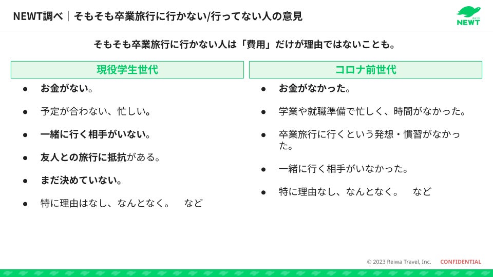 また、国内・海外問わず「そもそも卒業旅行に行かない」という方々にも、その理由を伺いました。