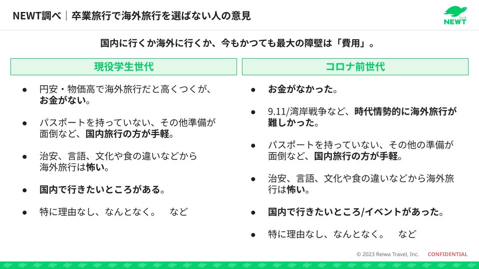 冒頭の結果から、どちらの世代においても、卒業旅行に行く人のうち「国内だけに行く」という意見が、卒業旅行に行く人の中で最も多い割合を占めました。その方々に、なぜ海外を選択しなかったのか、意見を伺いました。