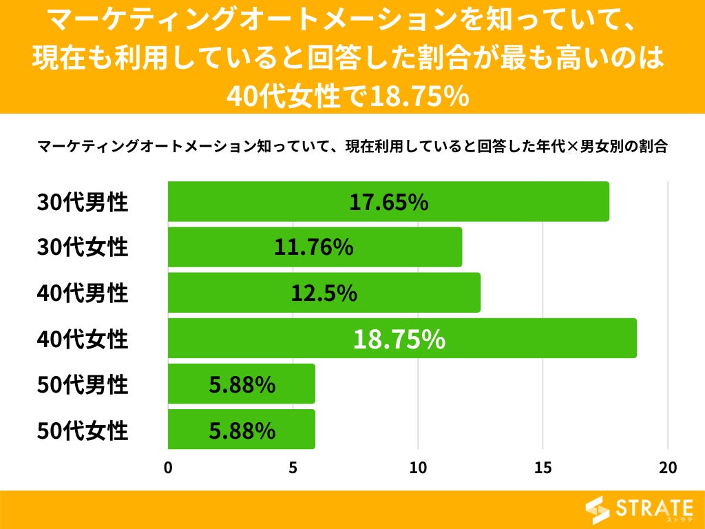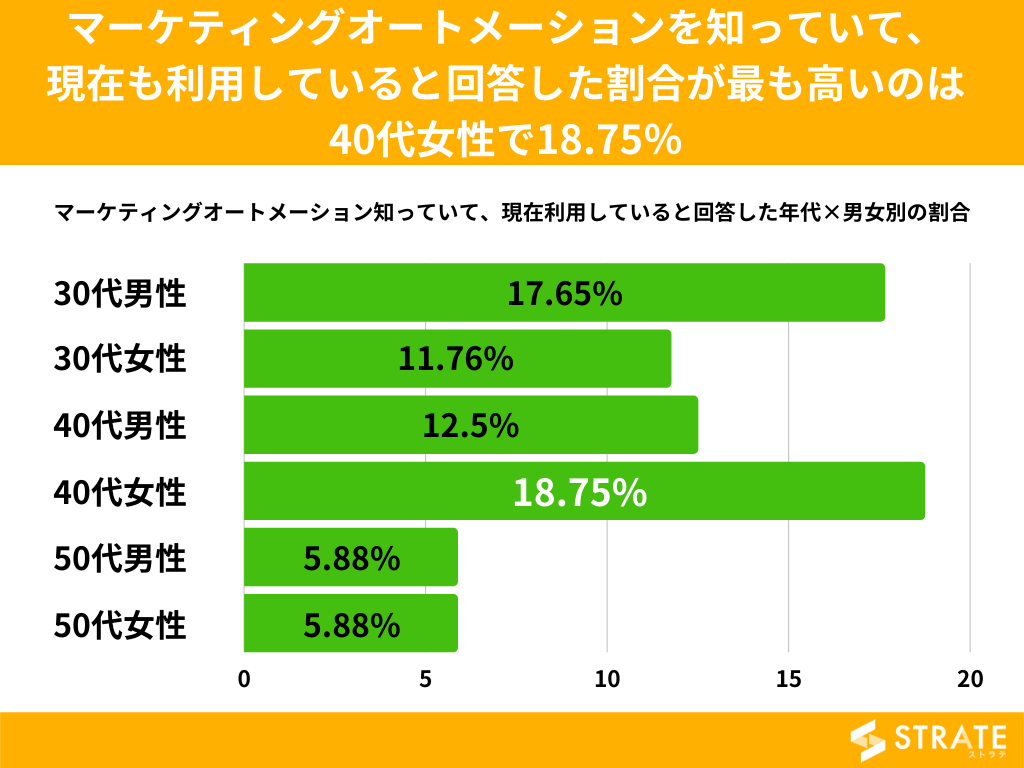 マーケティングオートメーションを知っていて、現在も利用していると回答した割合を年代×男女別でみてみますと、40代女性が最も多く18.75%、次いで30代男性の17.65%、50代は男女とも5.88%に及びました。