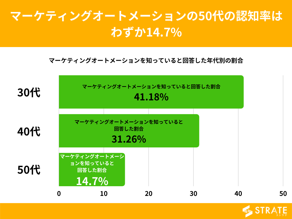 マーケティングオートメーションを知っていると回答した割合を年代別でみてみますと、30代が最も多く41.18%、次いで40代が31.26%、50代は14.7%にとどまりました。