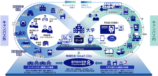 一方、 東北大学ではニューノーマル時代における新たな大学の姿を先導し、学生・教職員が今まで以上に学業や教育・研究活動に専念できる場を提供することを見据え、「オンライン事務化宣言」(注1) を行いました。その実現のため、窓口フリー、印鑑フリー、働き場所フリーを掲げた「業務のDX」や、学部入試での成績通知システムの導入、対面授業とオンライン授業を効果的に併用した授業等の取り組みによる「教育のDX」を実施し、DXの推進による大学経営の変革を行っています。併せて、「コネクテッドユニバーシティ戦略」(注2) では、主要施策のひとつである「大学経営の改革」で、データ活用による大学経営の高度化を掲げ、推進しています。将来的には先進的な学生サービスを共通IDでつなぎ、一人一人の行動や状況に沿う一貫したリアル体験を提供するデジタルな仕組みの実現を目指しています。