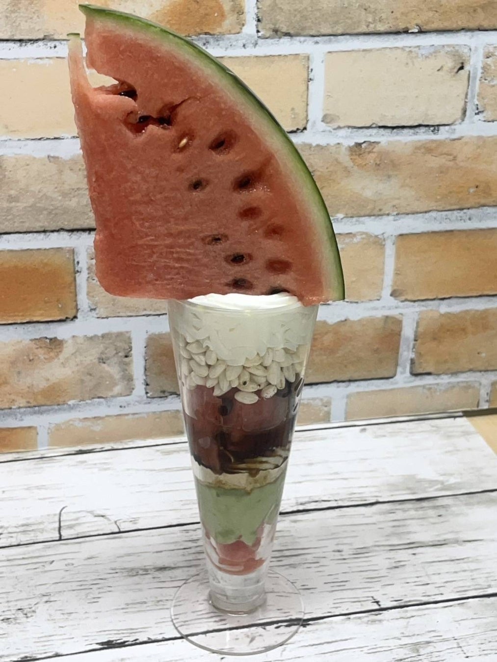 抹茶白バラミルクプリン、黒蜜、きなこ、あずき、白玉、バニラアイス、星空舞ポン菓子、生クリーム…そしてカットスイカもあちこちにちりばめられています。今年も、ももてなし家特製絶品鳥取すいかパフェの完成です!