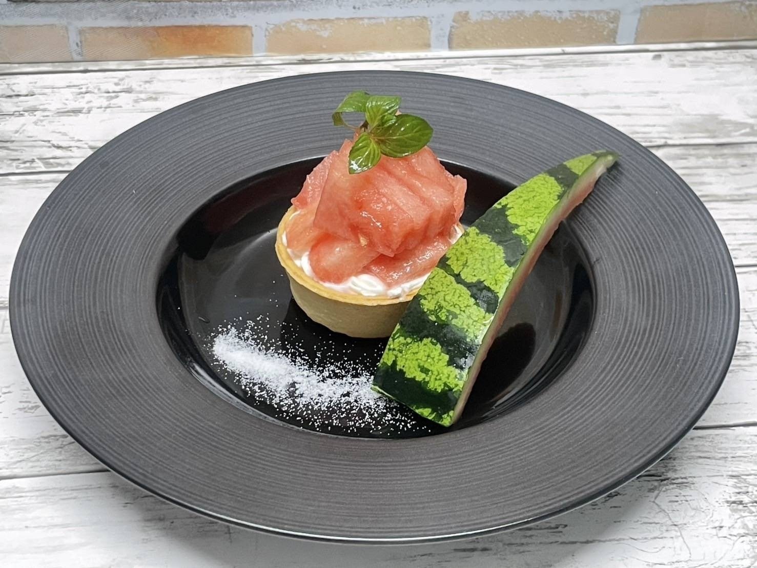 タルト生地の上には、スイカムース、生クリーム、カットスイカ。