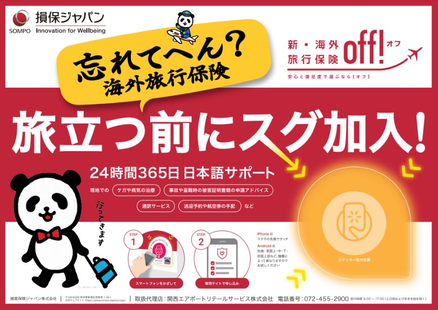 アクアビットスパイラルズ社のスマートプレート※1を使ったポスターを関西国際空港内30か所に掲示し、搭載されたポスターにNFC機能※2付きのスマートフォンをかざすだけで、「海外旅行保険off!」のサイトにて非接触で簡単に保険加入することができます。非接触で行うことでスマートフォンのみでスムーズに加入できるほか、感染症予防にも寄与いたします。