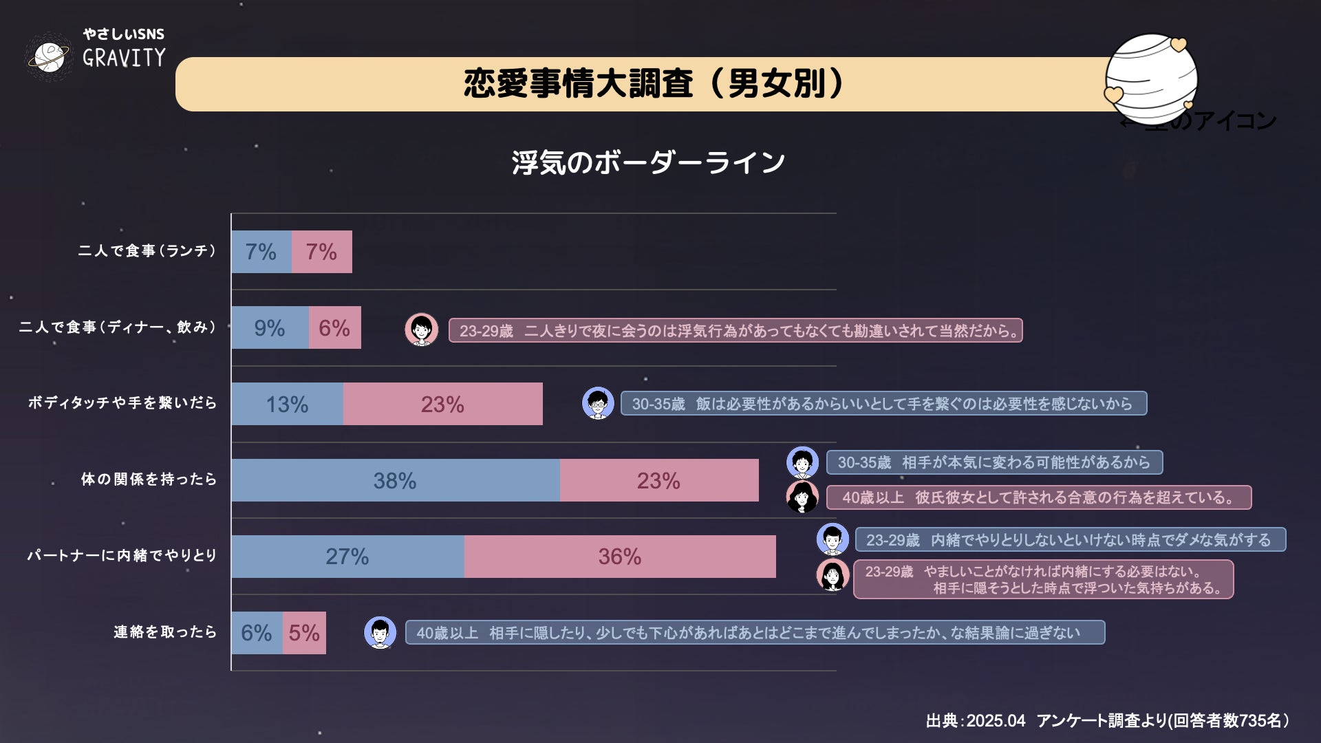 一方「パートナーに内緒で連絡を取ったら」が1位の女性のコメントの中には「やましいことがなければ内緒にする必要はない。相手に隠そうとした時点で浮ついた気持ちがある(23-29歳)」「パートナーに言えないようなことをしていたらソレはウワキなんじゃないのかな(30-35歳)」「浮気でなくてオープンな関係性なら内緒にする必要はないから(30-35歳)」。これは男性の2位にも入っており、そちらは同様のコメントが見られました。