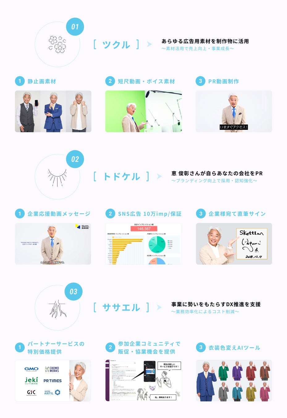 具体的には、地方出身のタレントの静止画/動画素材(ツクル)、タレントによるSNSでの告知や応援動画メッセージ(トドケル)、各パートナー企業によるサービス優待(ササエル)といった、さまざまなサポートがセットになった、革新的なプランです。