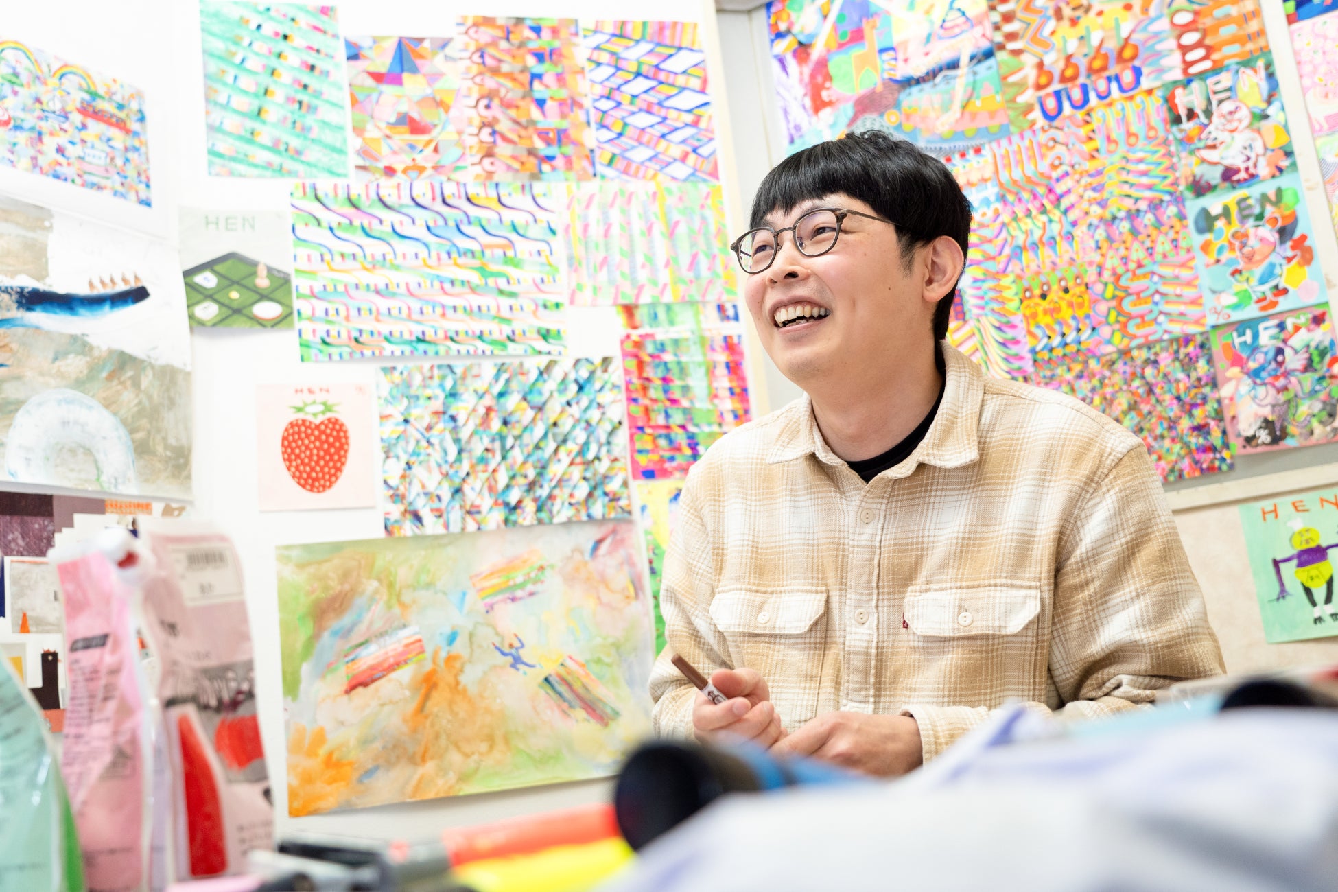 ペンやアクリル絵の具の他に着彩した紙を切り貼りするなど作風も