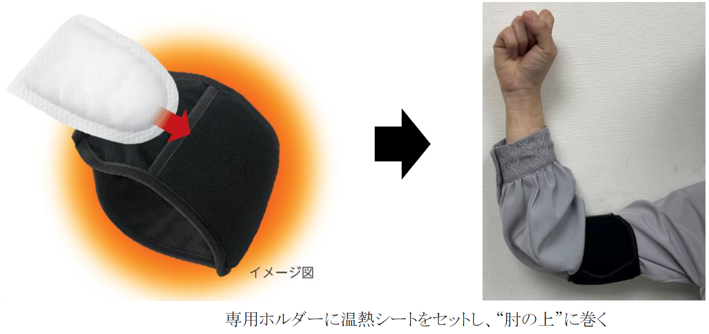 本製品は専用の温熱シートと専用ホルダーで“肘の上”を温めることにより、レイノー現象やつらい冷えなどの血行不良を改善します。